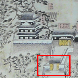 絵図に描かれている門の形式は屋根の付いた「薬医門」(または高麗門)のように見えます。