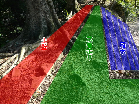 この武者走りの広さだと武器を持った兵士がすれ違うのは困難な気がするので、水平方向の移動は考えず雁木(階段)の昇り降りだけで兵を配置するために雁木の幅を広くしたのかも