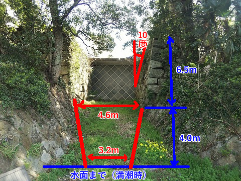 水門脇の石垣付近の地面は、豊川河畔の石にある水跡を頼りに測ると豊川水位(満潮時)から約4m、そこから石垣の上までが6.5~7m。石垣の角度が約10度