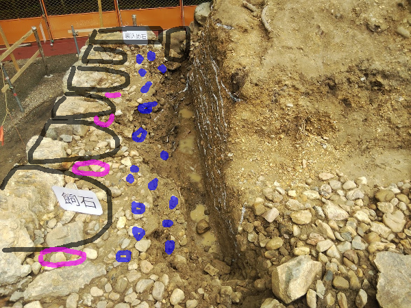 南面には玉石が多く見られる(この部分の土は赤っぽい)けど、