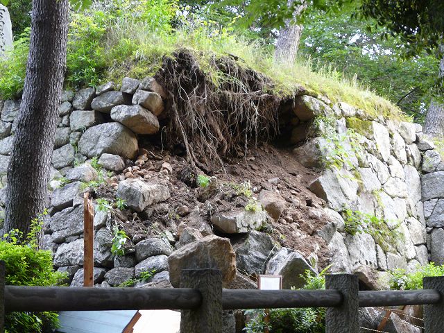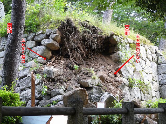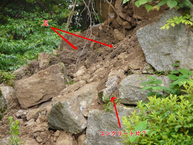 本丸広場側からのアップで撮った写真見ると、玉石の他に、瓦とかコンクリート片らしきものも写ってる。