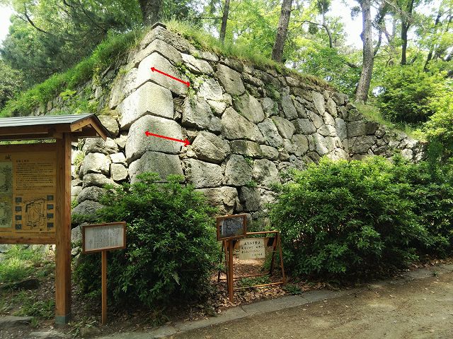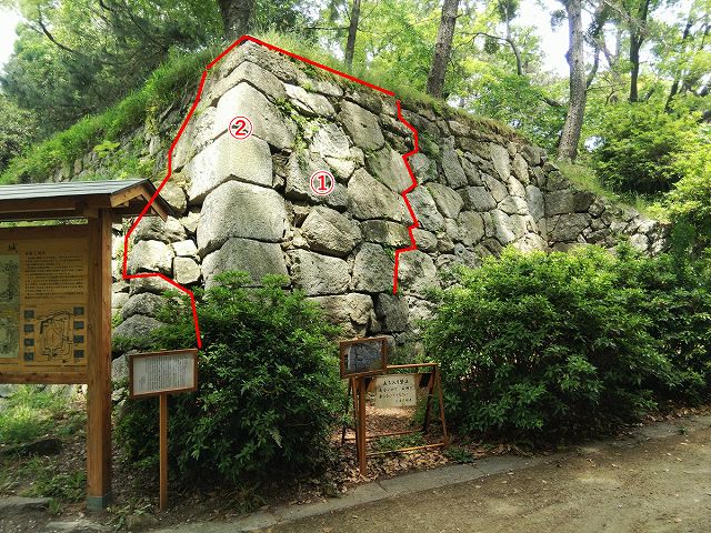 隅部(写真の②の部分)は整形された石が使われているけど、算木積としては石の長さが短かくて、平らな面に食付いていない感じ。(写真の①の部分は石が飛び出していたようにも見える)